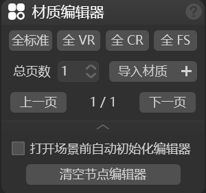 此功能是对材质编辑器进行操作,有如下功能:重置为标准材质或VR材质,CR材质。将所选材质或场景内所有材质导入到材质编辑器。还可以对材质编辑器进行翻页。清空节点编辑器常见问题:1.如果出现每次打开场景后材质编辑里面加载的材质库都需要重新渲染材质预览图?回答:取消打开场景前自动初始化编辑器即可。